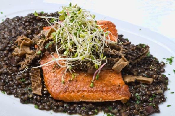 3. Izvaditi lososa iz marinade i pržiti ga sa svake strane oko 4 minuta, u teflonskom tiganju koji se ne lepi. Na kraju doliti i 3 kašike marinade u kojoj je stajao losos i pržiti još minut. Servirati lososa uz kuvano sočivo (preliveno pripremljenim dresingom) i sojine klice.