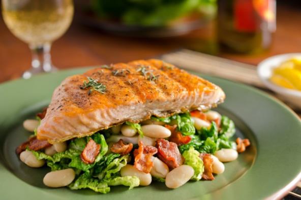 4. Pržiti losos u grill tiganju sa svake strane po 3 minuta. Posoliti i pobiberiti. Povrće po potrebi još začiniti i poslužiti sa lososom.