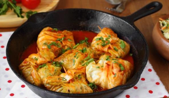 3. Na dlan stavite list kupusa, stavite fil i umotajte.
