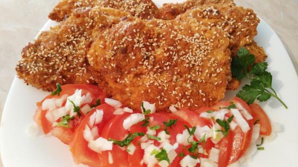 Meso svako parče dobro uvaljati u umak pa u prezle i redjati u pleh. Još malo pouljiti i posuti semnkicama ( ja sam posula susamom). peći na 190 stepeni C 40 min.