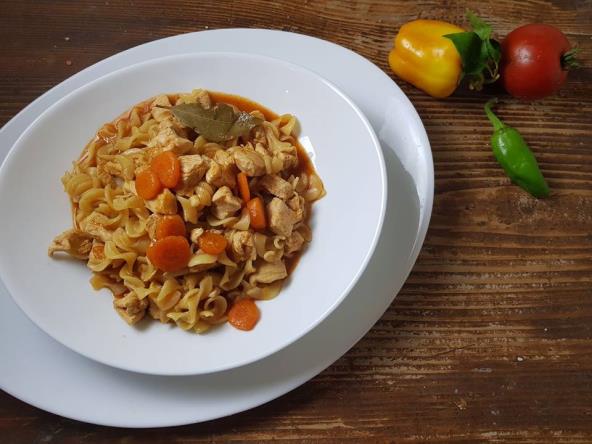 Očistiti i sitno iseckati glavicu crnog luka i propržiti blago na malo ulja. Očistiti koren peršuna i šargarepu i iseckati na kolutiće, usitniti papriku i beli luk i sve dodati u šerpu. Meso očistiti od kosti i iseći na kockice, dodati sa povrćem, začiniti po ukusu i naliti vodom da ogrezne. Ostaviti da se krčka na laganoj vatri dok meso ne omekša, zatim doliti još vode i ubaciti testeninu. Kada testenina omekša i paprikaš je gotov.