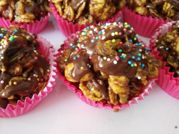 Istopiti margarin i čokoladu, zatim preliti kornifleks. Dodati seckane orahe, med, šećer i susam, pa dobro izmešati. Sipati kašikom u papirne korpice.