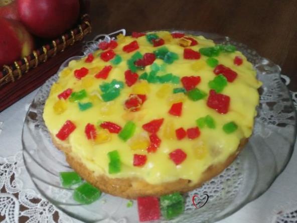 Odozgo naređati tanke kriške jabuke ili bilo kog voća. Peći u rerni na 200 stepeni 30-40 minuta. Ostaviti kolač da se ohladiti. U šerpu sipati mleko, dodati po želji šećer, vanilin šećer i skuvati puding. Vruć puding polako preliti preko kolača.