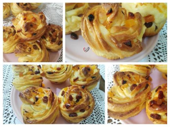 Kvasac potopiti u mlako mleko. Dodati šećer, jaja, koru limuna, ostatak mleka i jogurt, zatim brašno so i zamesiti glatko testo. Ostaviti da odmori 30 minuta pa ga premesiti i napraviti 12 loptica (zavisi koliko kalup-mafin ima otvora). Svaku lopticu tanko razviti i premazati maslacem, zatim naneti kajsije i suvo grožđem i sve urolovati. Raseći nožem po celoj dužini, ali ostaviti deo nerasečen.