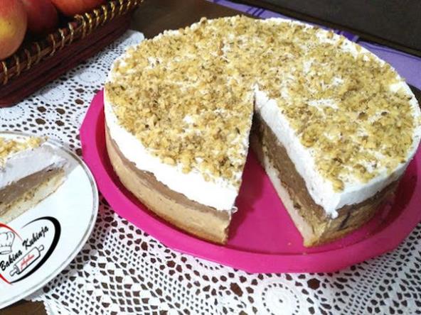 U šerpu sipati mleko dodati 4-6 kašika šećera i vanilin šećer. Žumanca umutiti, dodati gustin i malo vode, ubaciti u puding, a zatim sve izmešati pa kad mleko provri zakuvati kremu. Skloniti sa šporeta i u vruću kremu naseći listiće maslaca i izjednačiti. Kremu podeliti na dva dela. U jednu dodati čokoladu i izmešati, a u drugu orahe i izjednačiti.