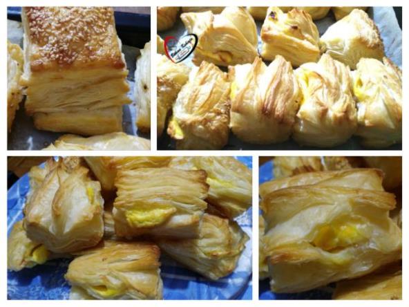 Izvaditi iz kese, razviti i opet presavijati. Tako uraditi 4 puta i peti put razviti testo pola cm. Iseći na pravougaonike. Izmešati sir i žumance, pa u svaki pravougaonik staviti kašičicu sira i saviti. Mogu se oblikovati i kao kiflice.