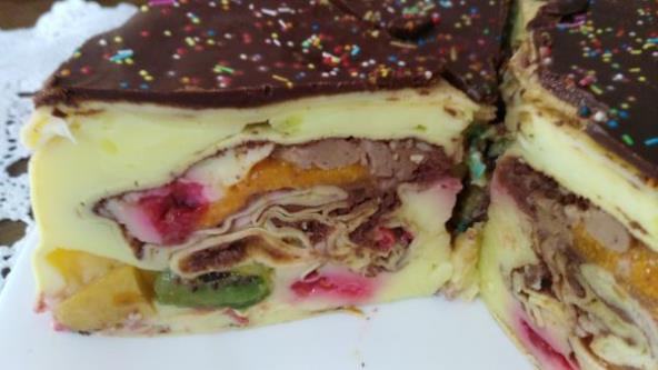 Preliti puding preko palačinki, dodati ostatak seckanog voća i ostatak pudinga. Vratiti palačinke koje su bile savijene preko pleha razmazati pudinga po njima i prekriti jednom palačinkom. Ostaviti da se dobro ohladi pa okrenuti na tanjir i preliti čokoladom. Ostaviti još da se stegne i seći kao tortu.