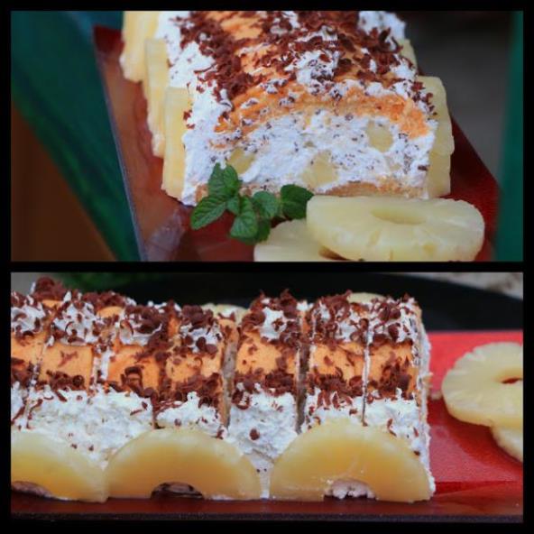 Kalup obložite folijom, iseckajte ananas, izrendajte 50 g čokolade. Umutite slatku pavlaku, ne morate odmah čvrsto jer će se još mutiti sa ostalim sastojcima. Dodajte pavlaku i šećer.