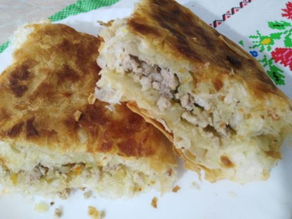 Na ulju propržiti glavicu luka, dodati meso, so i biber. Tepsiju okruglu obložiti pek papirom ili je samo namazati uljem, pa na dno staviti jednu koru i pouljiti. Sve sledeće kore premazati uljem, zgužvati i ređati u pleh.