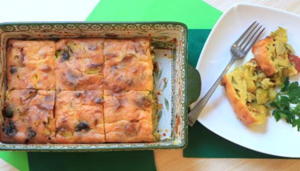 Umutite jaja i pavlaku, dodajte brašno, ulje, vodu, začine, iseckano peršunovo lišće. Ovim prelivom prekrijte povrće i odmah stavite u vrelu rernu da se peče oko 30 - 35 minuta na 230 - 240 stepeni.