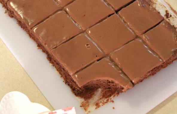 Varjačom umešajte brašno i prašak za pecivo, potom rastpoljenu čokoladu i margarin. Odmah izlijte u tepsiju i pecite oko 25 - 30 minuta.