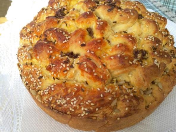 Ostaviti pogaču da poraste pa je premazati razmućenim jajetom i posuti semenkicama. Peći u prethodno zagrejanoj rerni na 180 stepeni oko 40 minuta. Na polovini pečenja pokriti folijom.
