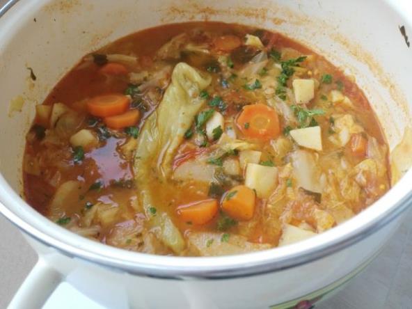 Kupus iseći na kocke krupnije, staviti pola u šerpu, a povrće iseći na kolutove ili kocke pa staviti u sredinu na kupus i pokriti drugom polovinom kupusa. Dodati papriku zelenu i list celera ili peršuna. Naliti vodom do pola i staviti da se kuva oko 45 - 50 min. Dodati začina i paradajz kad se kupus skuva.