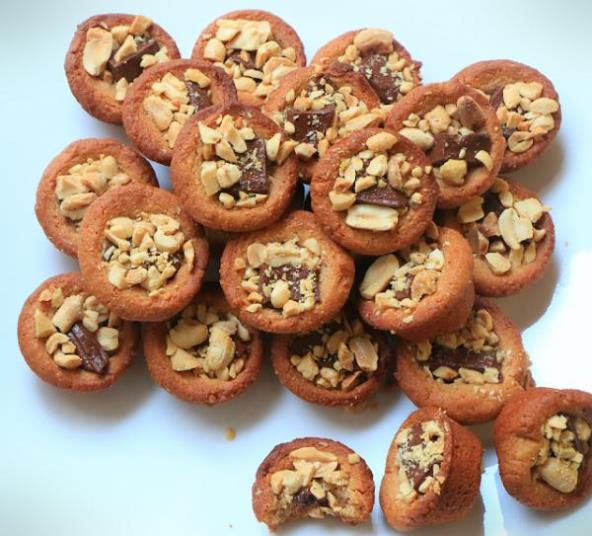 Umutite maslac, kikiriki puter, med. Dodajte jaje, cimet, brašno pa opet kratko umutite. Dodajte polovinu keksa, umutite pa opet ostatak keksa. Na kraju umešajte soda bikarbonu i od ove mase pravite male loptice. Kalup za male mafine namažite uljem ili puterom i u svaku rupicu stavljajte testo. Utisnite čepom za flaše i u svaku rupicu stavite komadić čokolade, kikiriki i pecite na 170 stepeni oko 25 minuta.