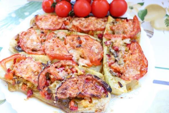 Izdubljene tikvice poređati u podmazan pleh i korita tikvice puniti dinstanim povrćem.