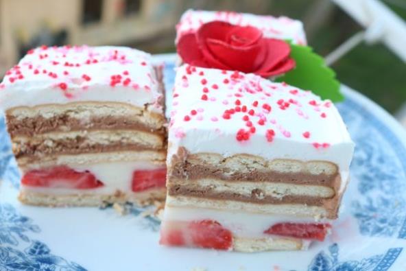 Keks umočiti u karamel mleko i ređati u poslužavnik. Preko njega naneti svetli krem pudinga, zatim voće, pa opet puding, zatim keks, pa tamni krem od čokolade, keks, pa ponovo tamni deo, keks i šlag.