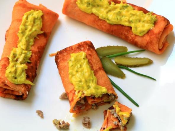 Sledi filovanje: na palačinku namažite jednu kašičicu kisele pavlake, stavite kašiku fila, preklopite stranice pa umotajte. Odozgo namažite po kašičicu - dve sosa ili ga poslužite pored..Spremno je za degustaciju.