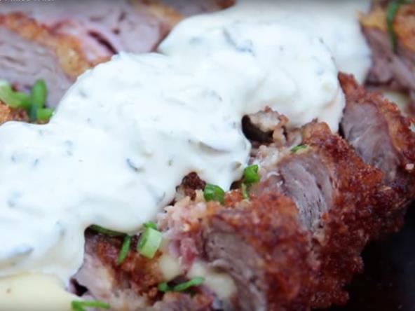100g domaćeg sira, pola šolje prezli, jaje, domaći majonez, parče govedine, mladi luk, brašno, par kiselih krastavčića.