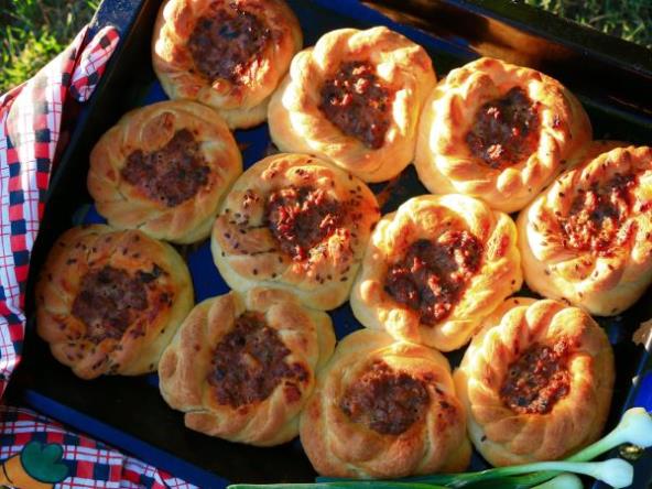 Razvucite testo modlom ili čašom pa vadite kolutove, složite na obloženu tepsiju i svaki kolut pritisnite manjom čašom da bi se napravilo udubljenje. Od ostataka testa napravite pletenice i stavite na kolutove tj. pogačice. Filujte smesom od mesa i premažite razmućenim mlekom i uljem. Odmah pecite u zagrejanoj rerni na 220 stepeni oko 30 minuta ili dok lepo ne porumene.