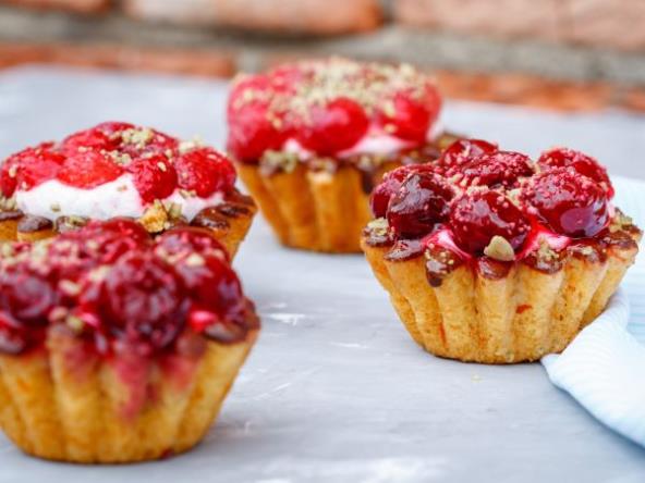 Jaje umutiti sa šećerom u prahu. Dodajte so, brašno i hladan puter pa urtljajte u testo. Ostavite da odstoji u frižideru sat vremena. Utisnite testo u modle i pecite u rerni zagrejanoj na 180 stepeni 30 minuta. U šerpicu nasuti mleko i šećer i ostaviti da prokuva. Dodajte puding i mešajte. Ostaviti da se malo ohladi pa umutiti puter. Umutite šlag pa pomešajte sa krem sirom. Umutite dok ne dobijete penastu masu pa pomešajte sa kremom od pudinga. Punite hladne korpice i odozgo poređajte maline/višnje.