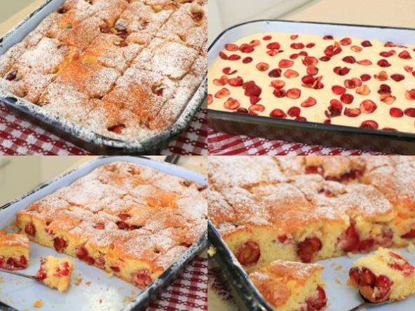 Očistite trešnje ili višnje. Uključite rernu da se zagreva na 200 stepeni. Podmažite tepsiju uljem i brašnom, dimenzije 30x25 (može i veća).