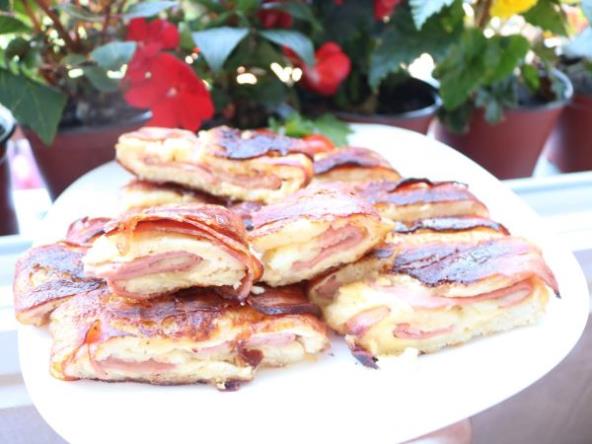 Svakoj kriški hleba odstraniti koricu pa oklagijom prepeglati sa jedne i druge strane. Na sto raširiti aluminisku foliju pa poredjati listove suve slanine.