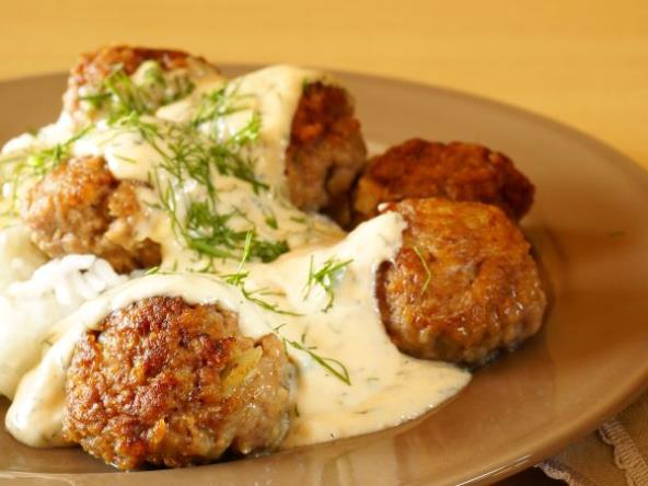 Izvaditi kuglice iz vode, staviti ih u posudu za pečenje, prelivati prelivom (pomešati pavlaku, jaja i ribani sir).Peci na 220 stepeni oko 15-20 minuta.