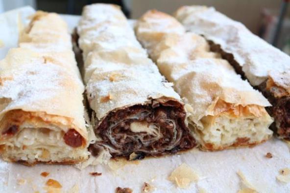 Ređati u pleh. Isto tako namazati i čokoladni fil..Premazati svaku rolnicu uljem i peći na 200 stepeni oko 50 min. Posuti prah šećerom i 1 vanilinim šećerom.