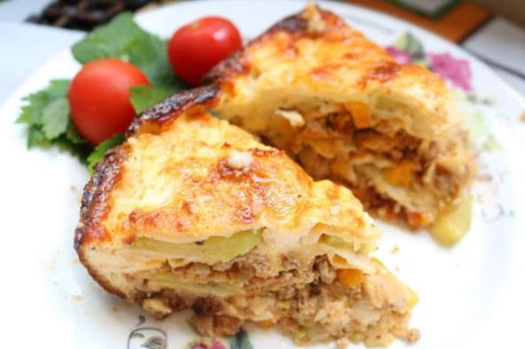 Svaki kolut tikvice provući kroz brašno, jaja i prezle i ređati na dno pleha. Preko staviti nekoliko kašika prženog mesa, pa opet tikvice pa meso, do utroška mlevenog mesa. Završiti sa tikvicama.