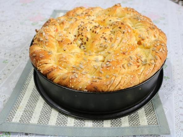 Svaki pravougaonik koji smo razvili premazati omekšalim maslacem sem zadnje, nju namazati sirom. Iseći na trake oko 2 cm pa traku uviti držeći za jedan kraj. Saviti u krug i staviti u sredinu pleha koji ste podmazali uljem. Ređati tako uvijene trakice sve u krug u tepsiju.
