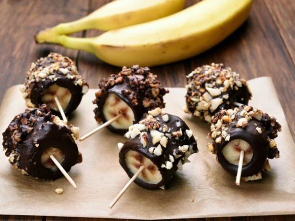 Istopiti čokoladu, banane preseći na pola, nabosti na štapić i umakati u čokoladu. Ostaviti na pek papir da se ocedi i stegne.