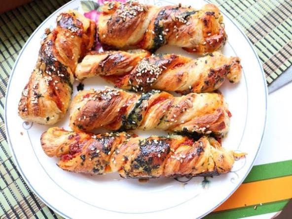 Stavljati jednu preko druge, seći trake po želji širine 2 cm uviti ih i ređati u podmazan pleh. premazati žumancetom i posuti susamom.