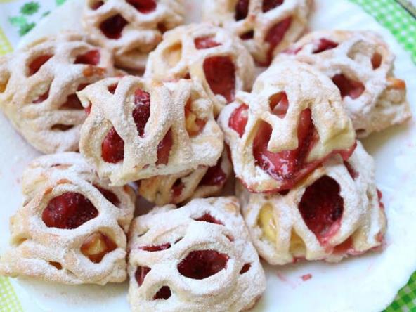 Ostaviti da poraste pa ga razviti 1/2 cm. Jednu polovinu testa iseći na kvadrate. Skuvati puding sa šećerom, pa kad se malo prohladi staviti po jednu kašičicu u svaki kvadrat, a odozgo po manju jagodu.