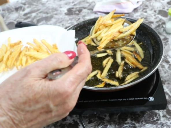 Tanjir obloziti papirnom salvetom pa przeni pomfrit redjati na papir.