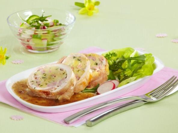 Pile odvojite od kostiju, ali tako da vam ostane u jednom komadu. Potom ga dobro izlupajte i napravite pravougaoni oblik. Meso posuti začinima, so, vegeta i malo bibera, pa namazati senfom. Ako hoćete da bude pikantno pomešajte običan i ljuti senf. Zatim ređate šunku, pa kačkavalj i na kraju šnite dimljene slanine. Šunka, slanina i kačkavalj bi bilo dobro da vam budu isečeni na tanke listove jer ćete tako lakše sve urolati...