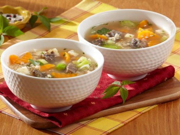 Crni luk sitno iseckati, pa izdinstati na ulju. Dodati meso isečeno na kockice (i kosti, ako ima), naliti vodom da ogrezne i dinstati na tihoj vatri oko sat vremena. Dodati povrće iseckano na kockice, začiniti solju i biberom, pa naliti oko 2 l vode. Napraviti i zapršku od dve kašike brašna, pa sve zajedno kuvati još oko pola sata.