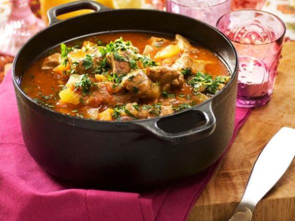 5. Nakon toga dodati krompir, sok od paradajza, lovor, mlevenu papriku i začine po ukusu, sipati vode koliko je potrebno da meso ogrezne i kuvati na umerenoj temperaturi dok svi sastojci ne omekšaju.
