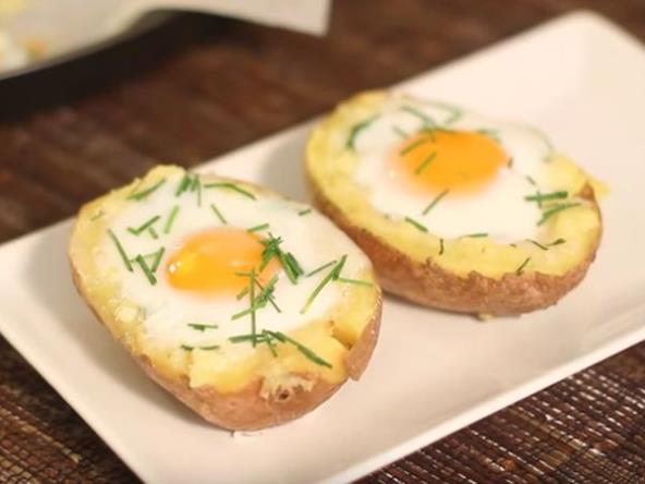 Na ulju malo propržite isečen crni luk i usitnjen beli luk, pa dodajte sredinu pečenog krompira. sve to malo propržite i umešajte kačkavalj. Mešajte dok se kačkavalj ne istopi pa sklonite s ringle. Ovu smesu stavite u krompir, ali ostavite malo udubljenje na sredini. Iznad svakog udubljenja razbijte po jedno jaje. Položite posudice s kropirom i jajima u tepsiju, na papir za pečenje, i ostavite da se peče oko 15 minuta na 180 stepeni.
