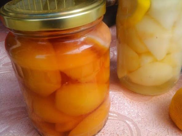 Voće oljuštiti i iseći na četvrtine pa poprskati limunom. U šerpu sipati 2 l vode, dodati šećer, pola limuna isečenog na krugove i vanilin šećer.