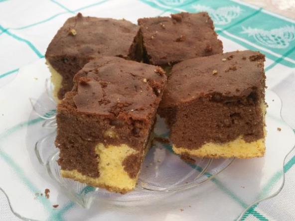 U tepsiju stavite pek-papir pa sipajte pola testa. U drugu polovinu dodate kakao i lepo izmešat. Tamnu smesu sipajte na belu masu šarajući po tepsiji. Malo protresite tepsiju.
