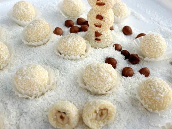 Od ove mase praviti kuglice i u svaku kuglicu staviti lešnik i uvaljati u kokos. Ostaviti jedan dan da stoje u frižideru i poslužiti.