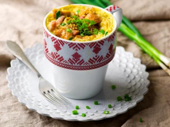 Integralno pecivo iscepkajte na manje komadiće, pa ga pomešajte sa kiselim mlekom. Umutite jaje s mlekom, solju i biberom. Dodajte i senf ukoliko želite. U šolju stavite "testo", preko toga prelijte jaje i preko svega stavite iseckanu šunku i mladi luk. Pecite 70 sekundi u mikrotalasnoj - ukoliko volite da jaje bude malo sočnije, možete da izvadite iz mikrotalasne i posle 60 sekudni.