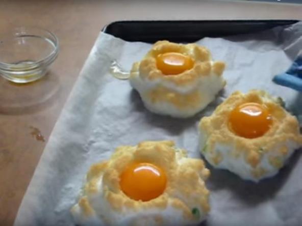 Zagrejte rernu na 190˚C, a pleh obložite papirom za pečenje. Odvojite žumanca od belanaca. Belanca mutite dok ne postanu dovoljno tvrda. U njih vrlo pažljivo umešajte parmezan i so. Pomoću kašike stavljajte pripremljena belanca na pleh tako da dobijete 8 oblačića. Oblom stranom kašike napravite udubljenja u svakom belancetu. Pažljivo stavite po jedno žumance u svaki oblačić.