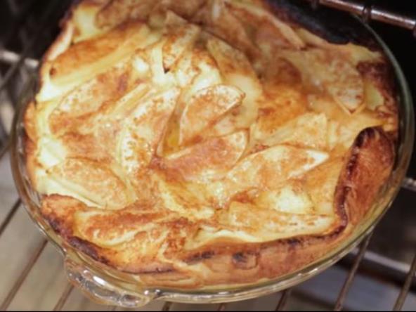 Umutite 6 jaja, dodate mleko i brašno, i sve zajedno umutite. Smesi dodate i malo soli. U rerni rastopite puter, kada postane tečan, dodate kriške isečenih jabuka (potrebne su vam tri veće jabuke) i vratite ih u rernu. Držite tako dok puter ne počne da "cvrči". Najbolje bi bilo da to radite u vatrostalnoj posudi.