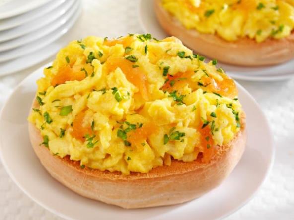 Dok se jaja kuvaju, dodajte 28 do 14 grama iseckanog dimljenog lososa i jednu supenu kašiku krem sira i mladog luka.