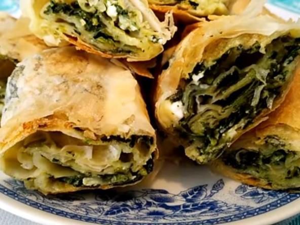 Mlad luk iseckati i ispržiti na ulju. Spanać oprati i iseckati na rezance. Kad se luk malo uprži dodati spanać i dinstati da ispari voda. U pržen i prohlađen spanać dodati umućena jaja i izdrobljen sir. Sipati i malo mleka. Sve lagano i dobro izmešati i sjediniti. Prostreti prvu koru, malo je pouljiti, pa dodati drugu koru, koju ste taskođe malo pouljili, savijte je kao harmoniku pa je stavite u vrh lista, tako i drugi list i treći. Zatim razvući po korama malo fila, saviti krajeve i urolovati. Tako i sa ostalim korama dok se ne utroši sav fil. Premazati rolnice malo uljem i peći u rerni na 180 stepeni oko 30minuta da lepo porumene. Seći vruće i služiti uz jogurt.