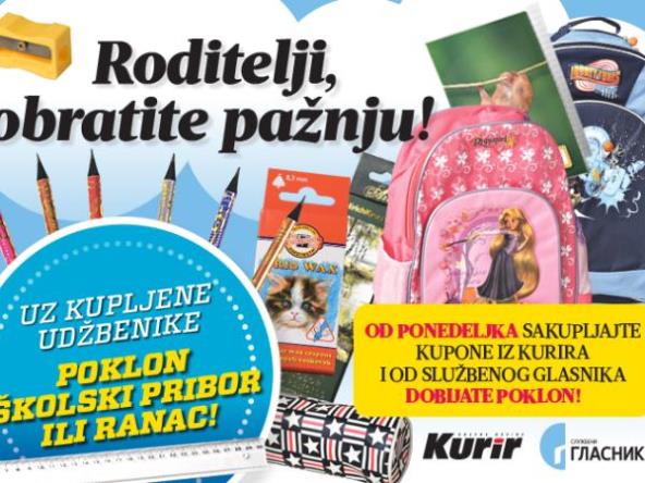 3. Kada sakupite svih 5 kupona i zalepite ih na talon, posetite bilo koju knjižaru "službenog glasnika" i prilikom kupovine udžbenika, predajte popunjen talon. u zavisnosti od cene, dobijate odgovarajući poklon: komplet školskog pribora ili ranac.
