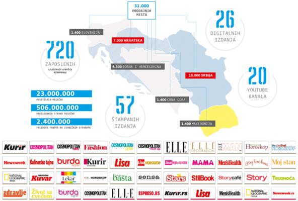 Adria Media Group, u svom multimedijalnom portfoliju ima 57 štampanih i 26 digitalnih izdanja, među kojima su dnevni list Kurir, Story, Elle, National geographic, Cosmopolitan, Mens Health, Sensa, Lisa, portal Espreso. Partner je najvećih svetskih izdavača kao što su Hearst, Newsweek, Hachette, Financial times, National geographic i Rodale.
