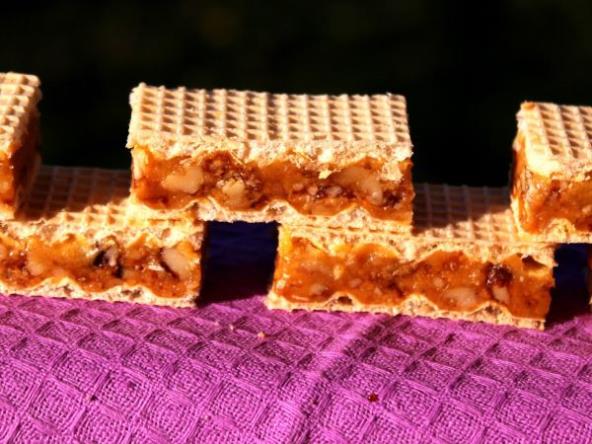 Orahe iseckati na krupnije, staviti u širu posudu šećer da se otapa. Mešajte da ne zagori i kada se sav šećer otopio i dobio je karamel boju umešajte brzo iseckane orahe. Ovu vruću masu brzo istresti na pek papir, malo razvući i ostaviti da se stegne i ohladi. Karamelizovane orahe staviti u krpu i izlupati ih sa čekićem za meso. Ne treba da bude jako sitno. U jednu dublju šerpu staviti vodu da proključa, u nju ubaciti drugu manju šerpu u kojoj su žumanca i šećer. Mutiti mikserom 1-2 minuta, zatim nastaviti kuvati oko 20 minuta uz često mešanje sa varjačom. Zatim ubaciti margarin ili maslac, mešati dok se ne otopi i skloniti sa šporeta. Fil od žumanaca i prženi šećer sa orasima izmešati i odmah dok je vruće mazati preko jedne kore. Prekriti sa drugom oblatnom i pritisnuti sa neki predmetom. Ostaviti da se dobro stegne i seći štanglice.