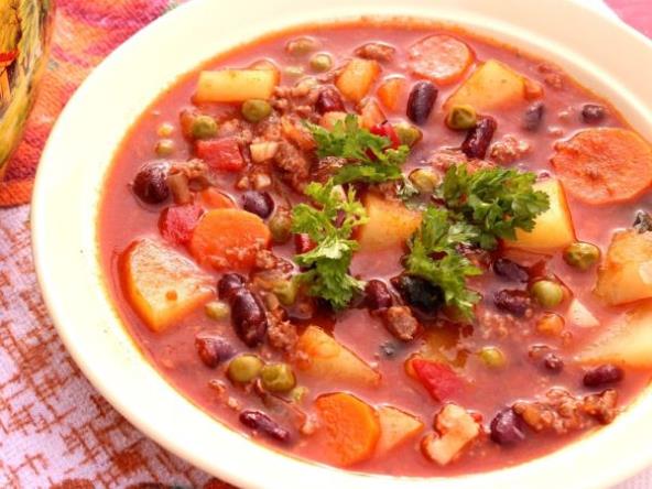 Povrće oguliti oprati i prvo dinstati iseckan luk sa uljem, dodati meso, čašu vode i nastaviti sa kuvanjem par minuta. Zatim dodati svo iseckano povrće osim belog luka, peršunovog lišća i crvenog pasulja. Naliti sa kuvanim paradajzom i vodom. Kuvati dok povrće ne omekša, na kraju začiniti dodati iseckan beli luk, pasulj i lišće. Kuvati još par minuta i poslužiti.